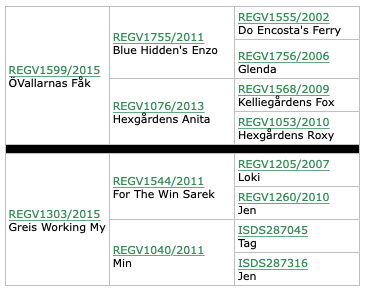 Färg: Brun & vit Pälslängd: Långhårig Storlek: ca 51 cm hög & 18kg HÄLSA Höfter: A/A Armbågar: 0/0 DNA tester: Genetiskt fri vi föräldrarna för IGS, MDR1, TSN & NCL MERITER ★ Svensk Viltspårs Champion ★ Uppfl. Rallylydnad Mästarklass ★ RLD A ★ RLD F ★ RLD N ★ Genomfört BPH ★ Godkänt Doftprov i Eukalyptus ★ Good på Nordic Show Utställning FEM-BESKRIVANDE ORD FRÅN ÄGAREN Lekfull – Snabb – Stark – Intensiv – Attityd ÄGARE Kennel Greis Working |